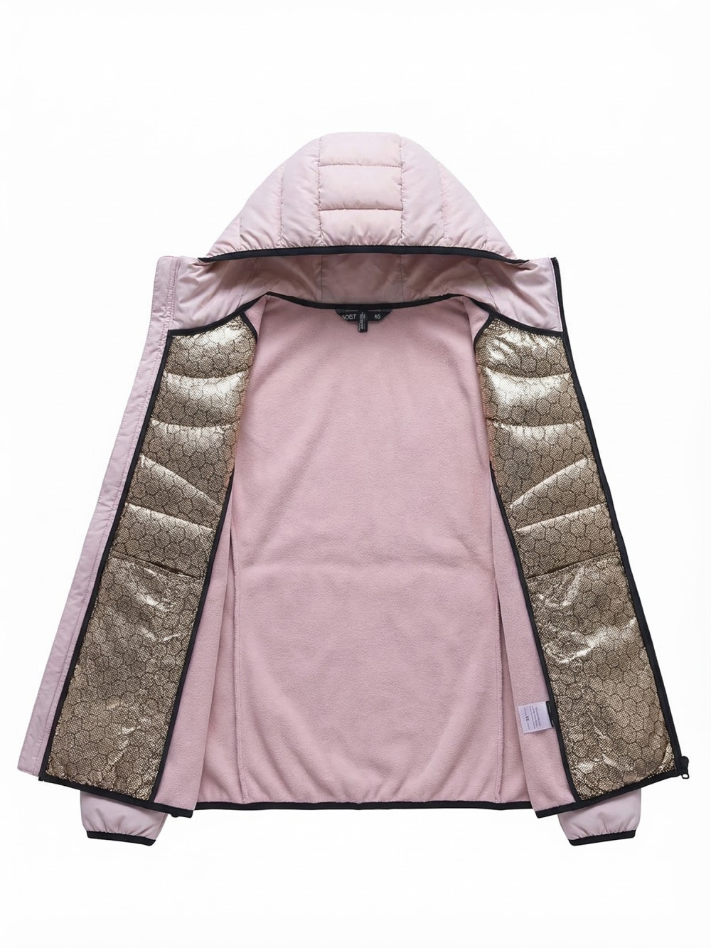 Внутренняя часть куртки выполнена из комбинированной подкладки: теплосберегающая фольгированная подкладка с графеновым покрытием помогает отражать тепло тела и сохранять его внутри, а мягкая флисовая подкладка создаёт дополнительное ощущение уюта и комфорта при носке. Такое сочетание материалов позволяет поддерживать комфортную температуру и делает куртку особенно приятной в прохладную погоду.