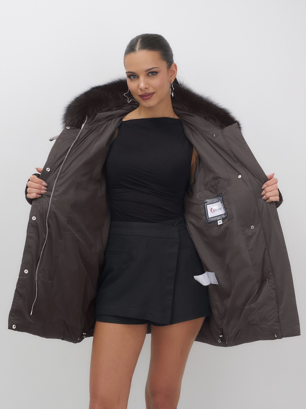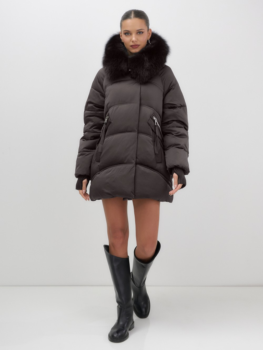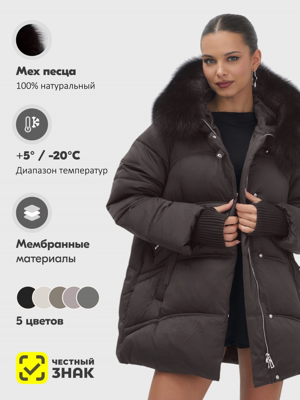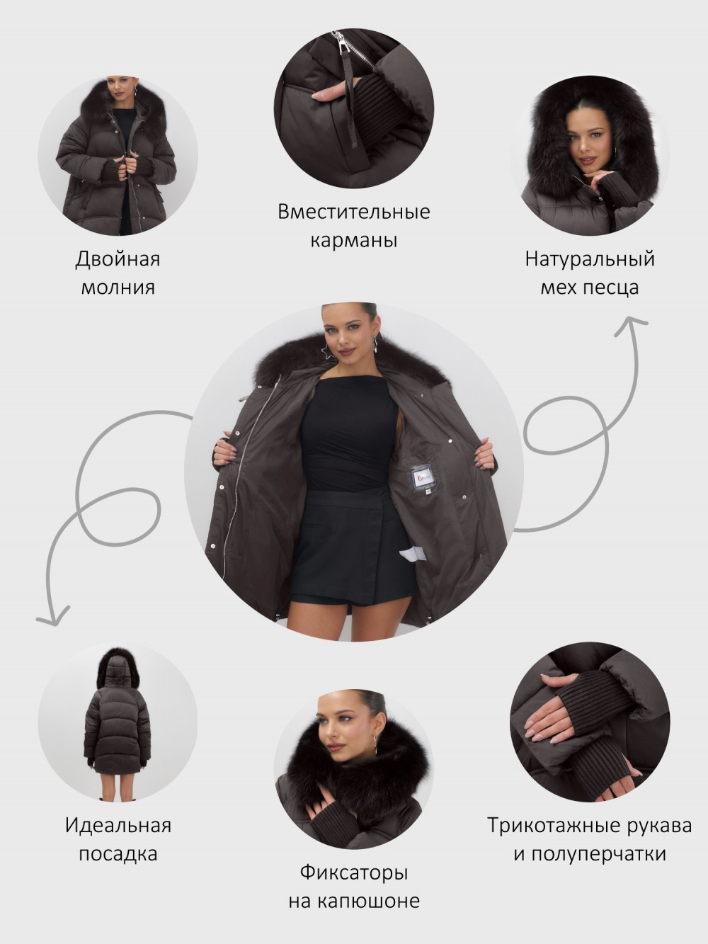 Пять трендовых оттенков сезона осень-зима 2025 – глубокий черный, благородный коричневый, нежный светло-коричневый, изысканный темно-зеленый и элегантный бежевый – идеально сочетаются с роскошным мехом песца. Удлиненный силуэт до колена и свободный крой создают идеальные пропорции для размеров 46-54.