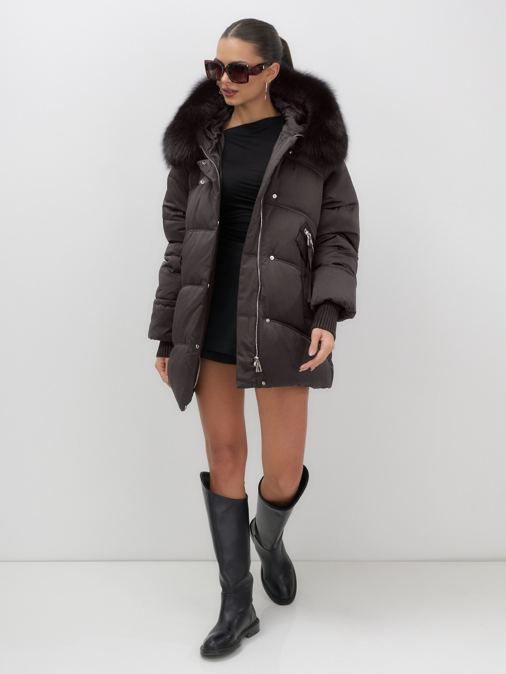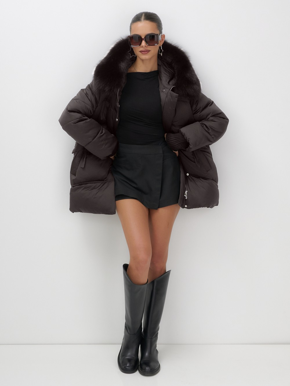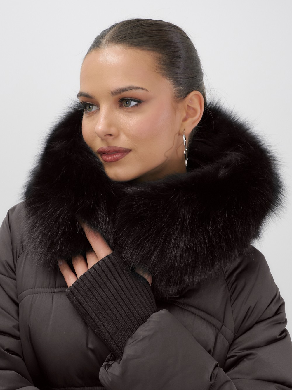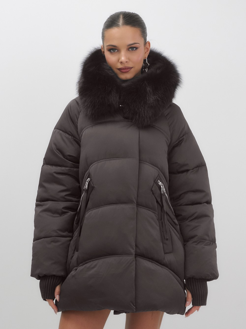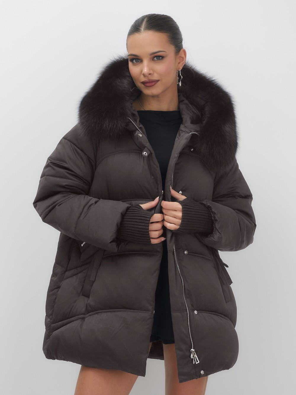 Пять трендовых оттенков сезона осень-зима 2025 – глубокий черный, благородный коричневый, нежный светло-коричневый, изысканный темно-зеленый и элегантный бежевый – идеально сочетаются с роскошным мехом песца. Удлиненный силуэт до колена и свободный крой создают идеальные пропорции для размеров 46-54.