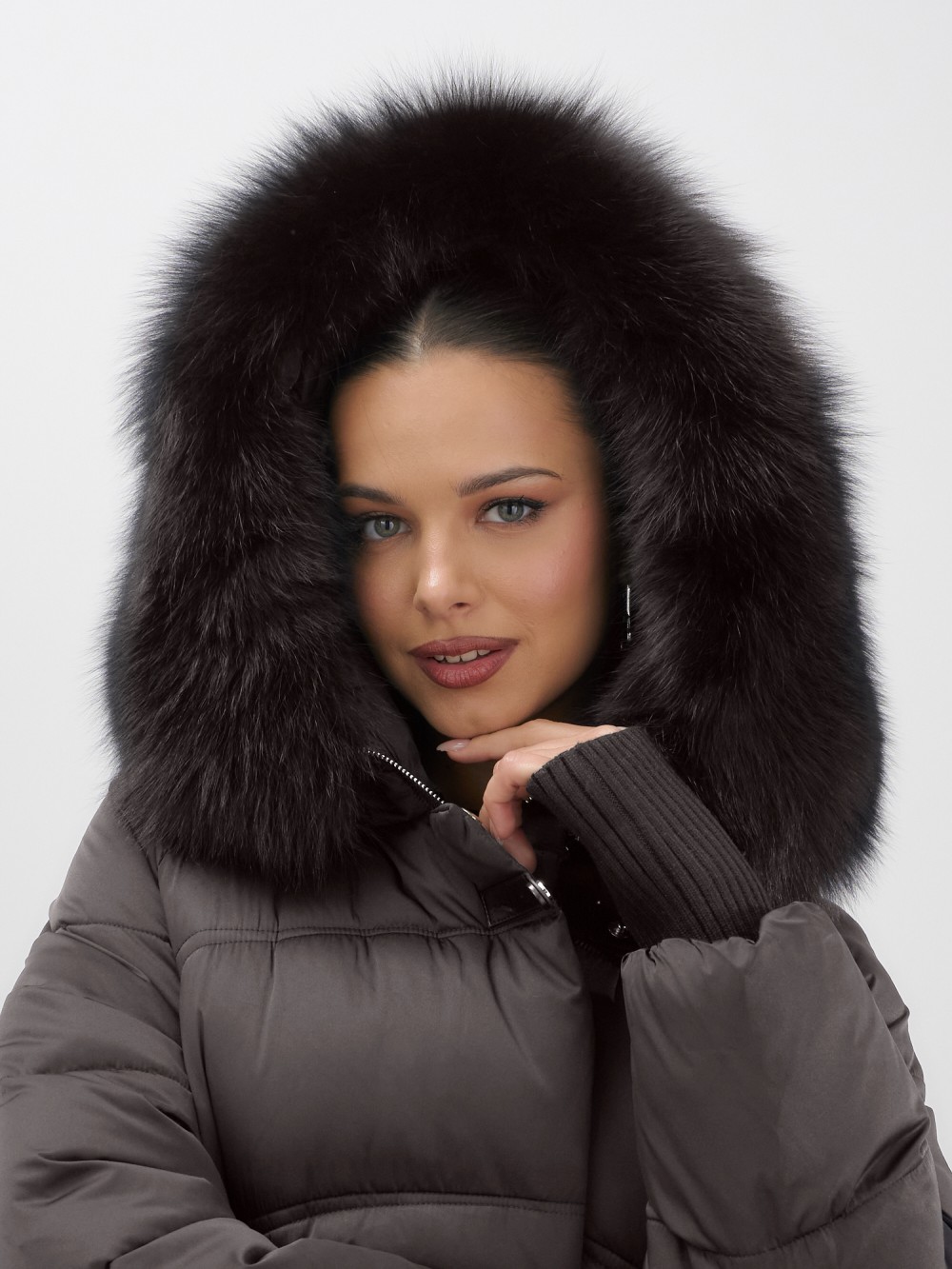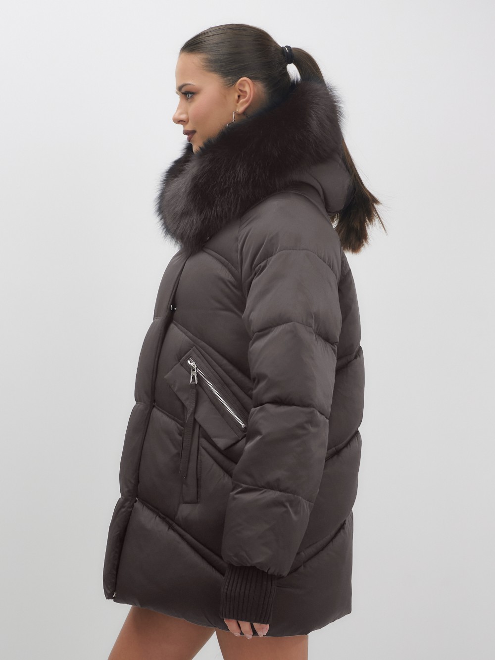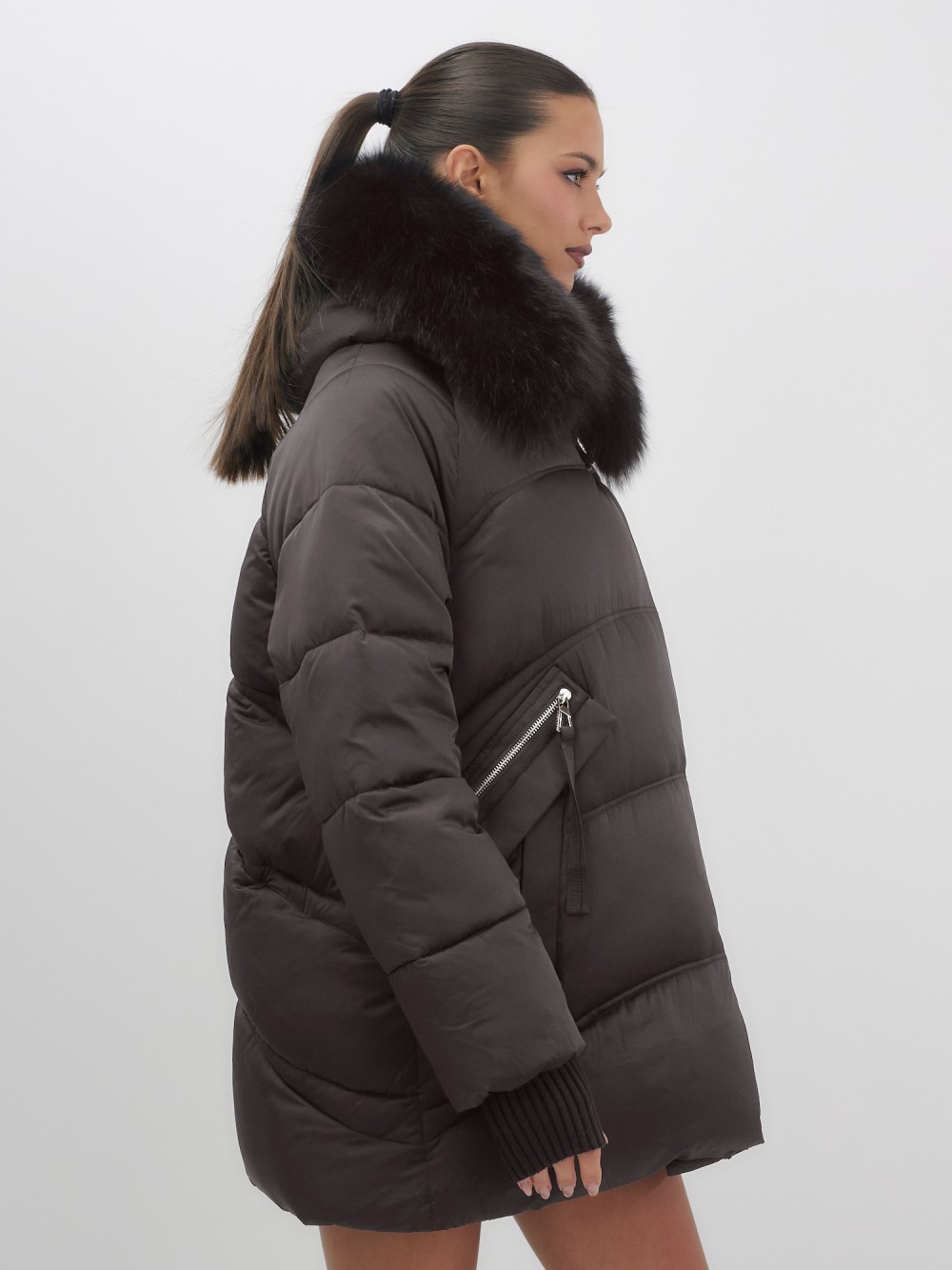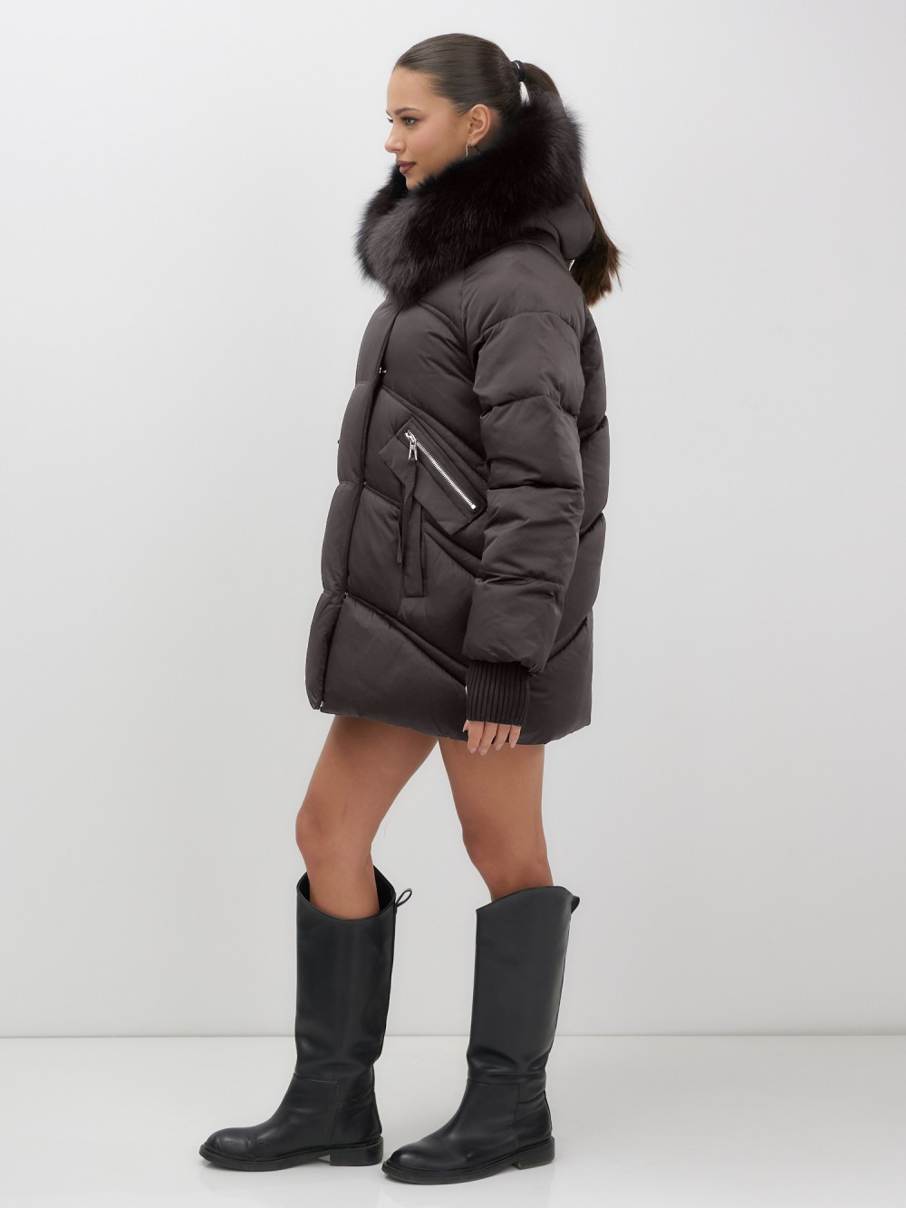 Пять трендовых оттенков сезона осень-зима 2025 – глубокий черный, благородный коричневый, нежный светло-коричневый, изысканный темно-зеленый и элегантный бежевый – идеально сочетаются с роскошным мехом песца. Удлиненный силуэт до колена и свободный крой создают идеальные пропорции для размеров 46-54.