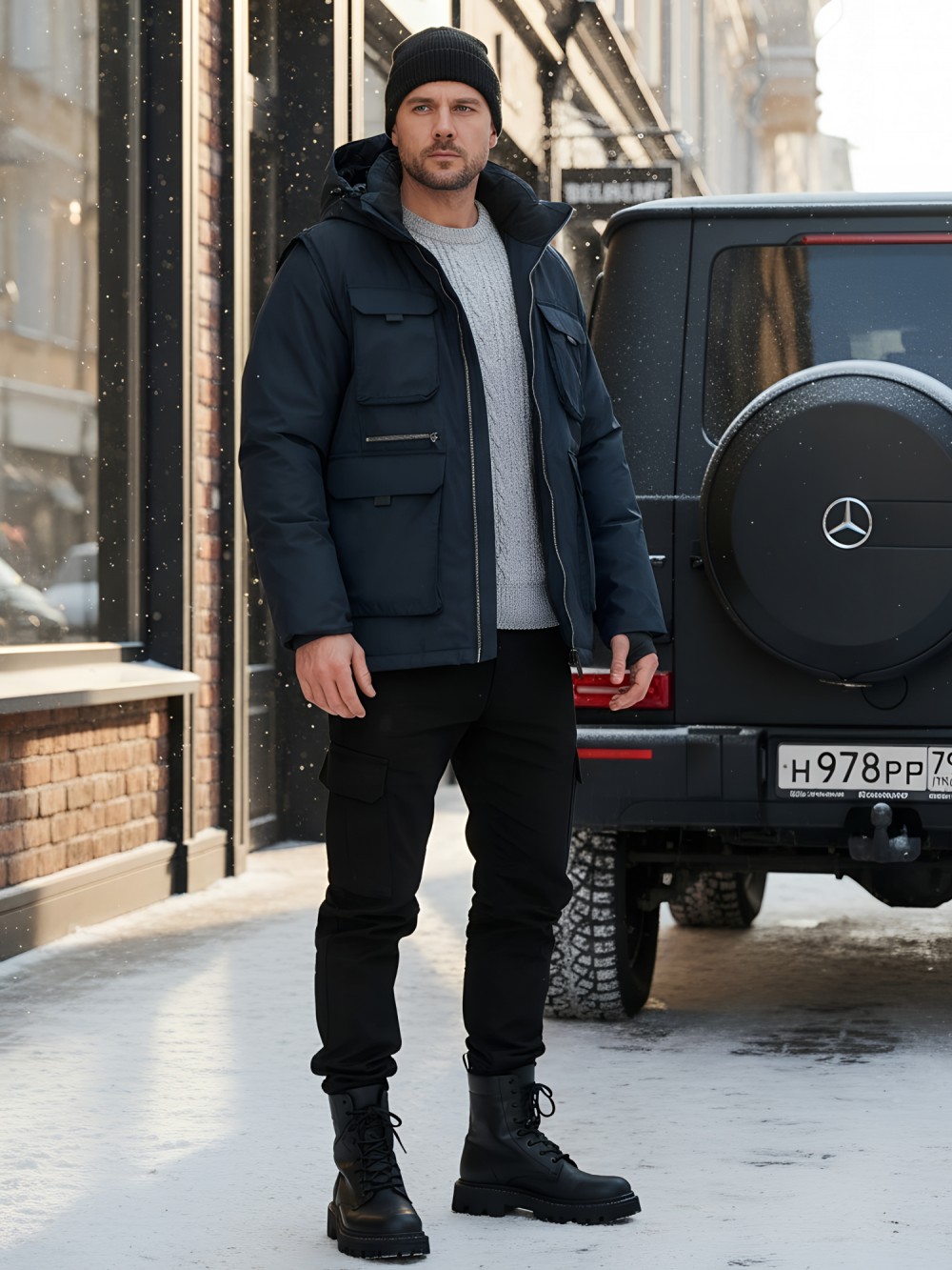 - Удобство и функциональность: Накладные карманы предоставляют достаточно места для хранения мелочей, а регулируемый съемный капюшон и манжеты помогут адаптировать изделие под любые условия.