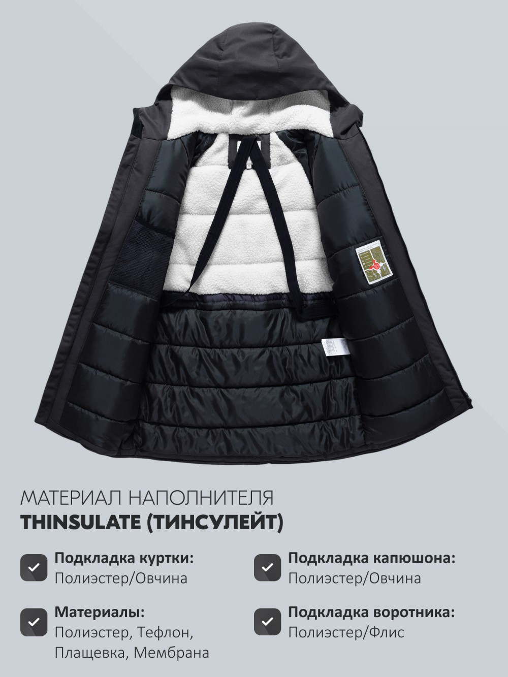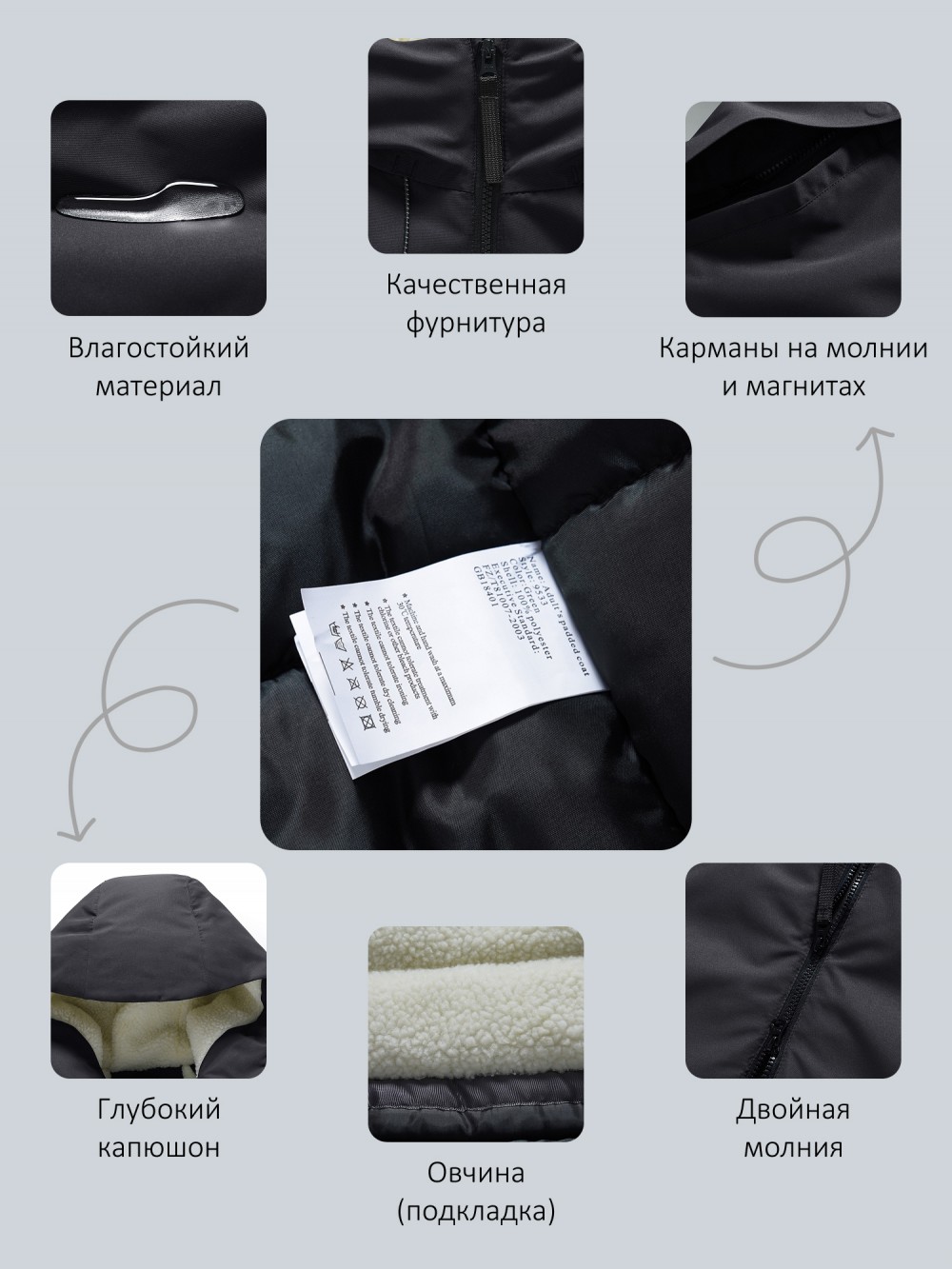 Внутренняя подкладка из овчины, полиэстера и флиса делает парку тёплой и уютной, несъёмный капюшон надёжно защищает от снега и ветра, а воротник-стойка прикрывает шею. Регулируемые фиксаторы на рукавах и капюшоне помогают удерживать тепло, трикотажные манжеты дополнительно блокируют холод. Вместительные карманы с начёсом на молнии и магнитах позволяют согревать руки и носить с собой необходимые вещи. Модель выполнена в универсальных цветах — сером, чёрном, хаки и тёмно-синем, легко сочетаясь с любым стилем одежды.