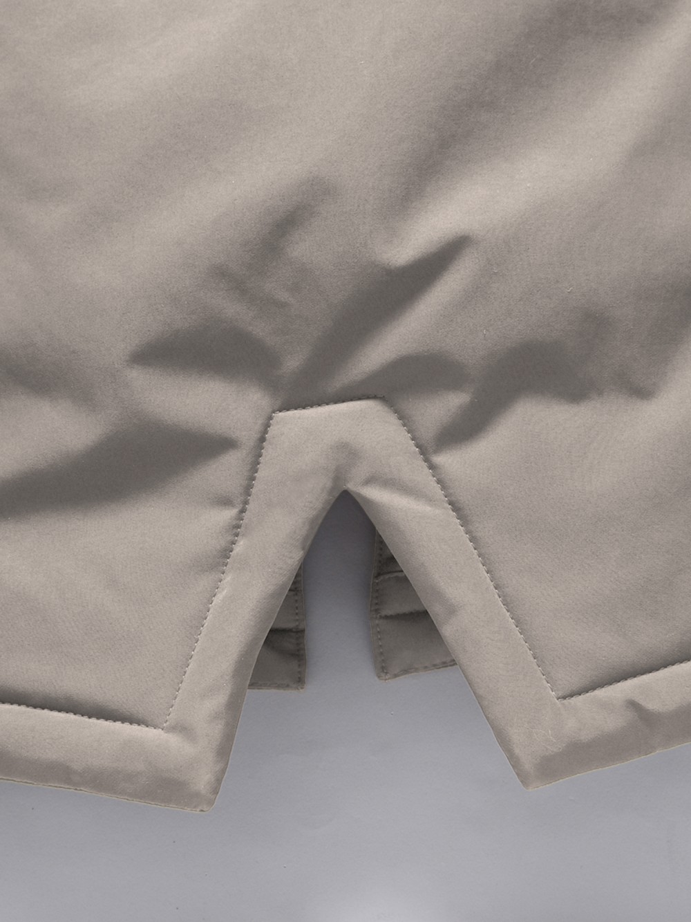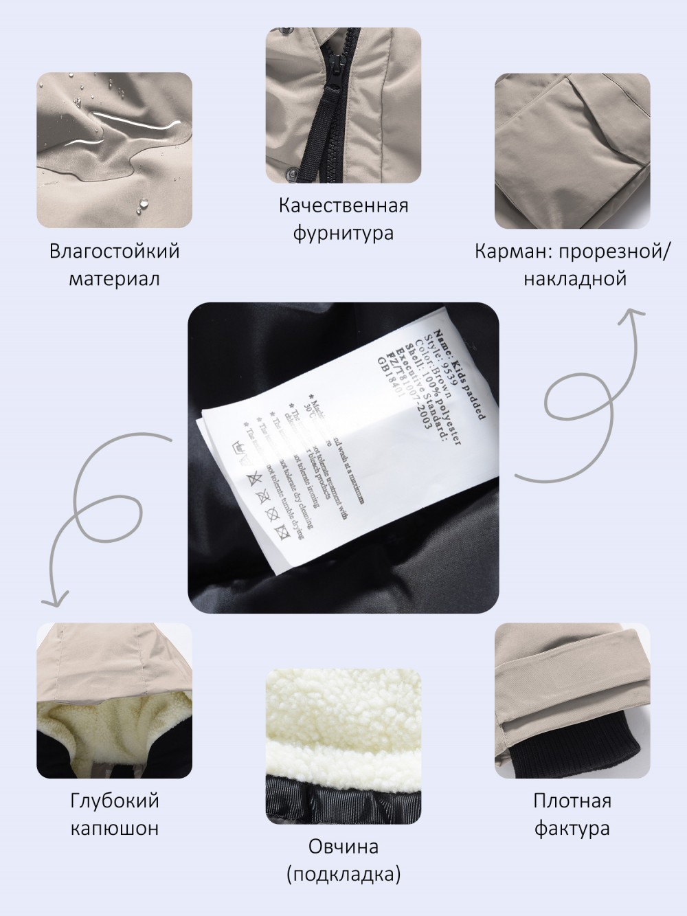 На рукавах и капюшоне предусмотрены регулируемые фиксаторы, которые позволяют удерживать тепло и подстраивать посадку под ребёнка. Манжеты из трикотажа не пропускают холодный воздух, сохраняя руки в тепле. Двойная молния с клапаном на кнопках надёжно закрывает парку и предотвращает продувание.