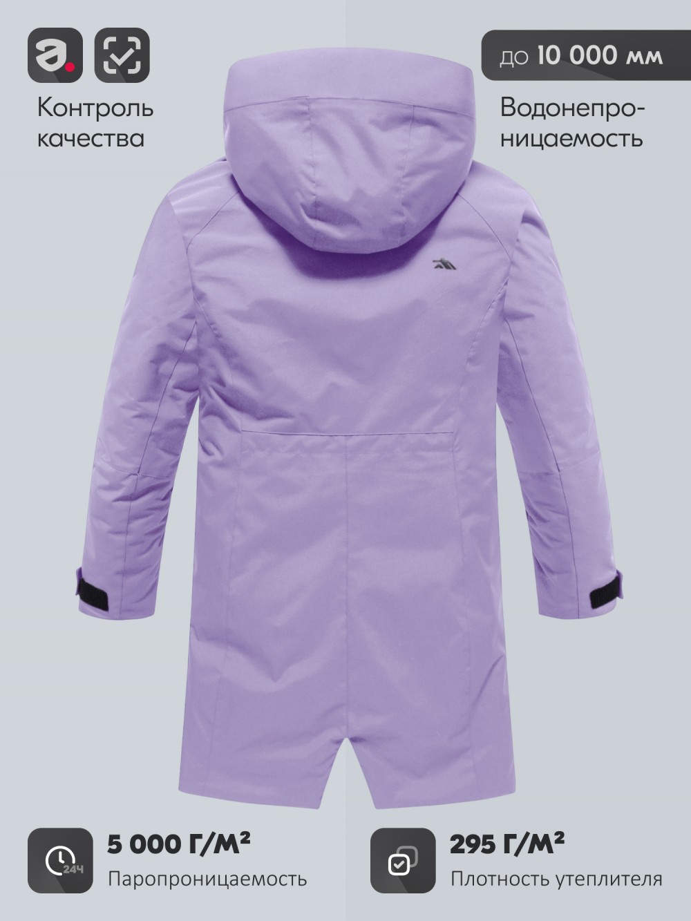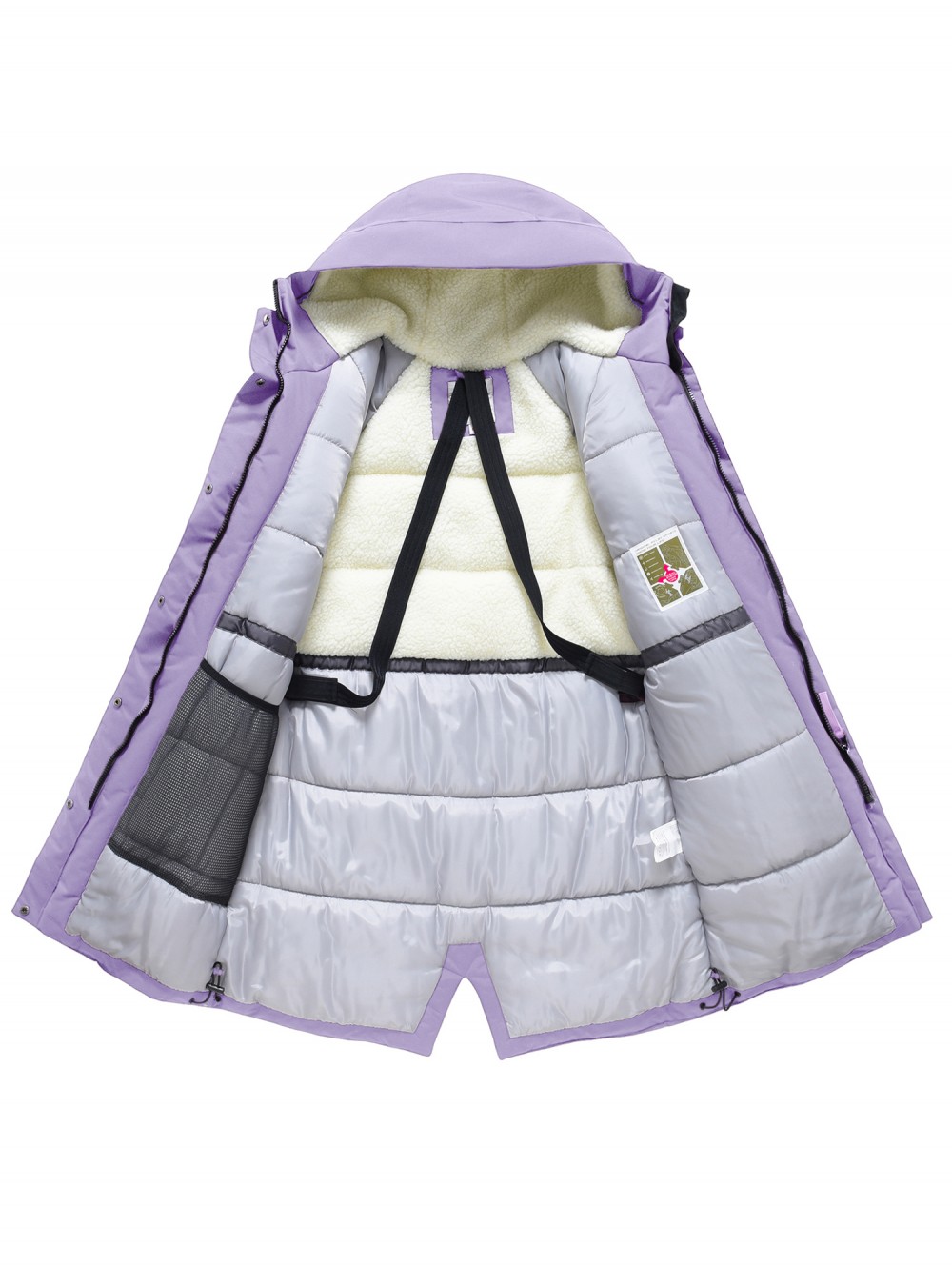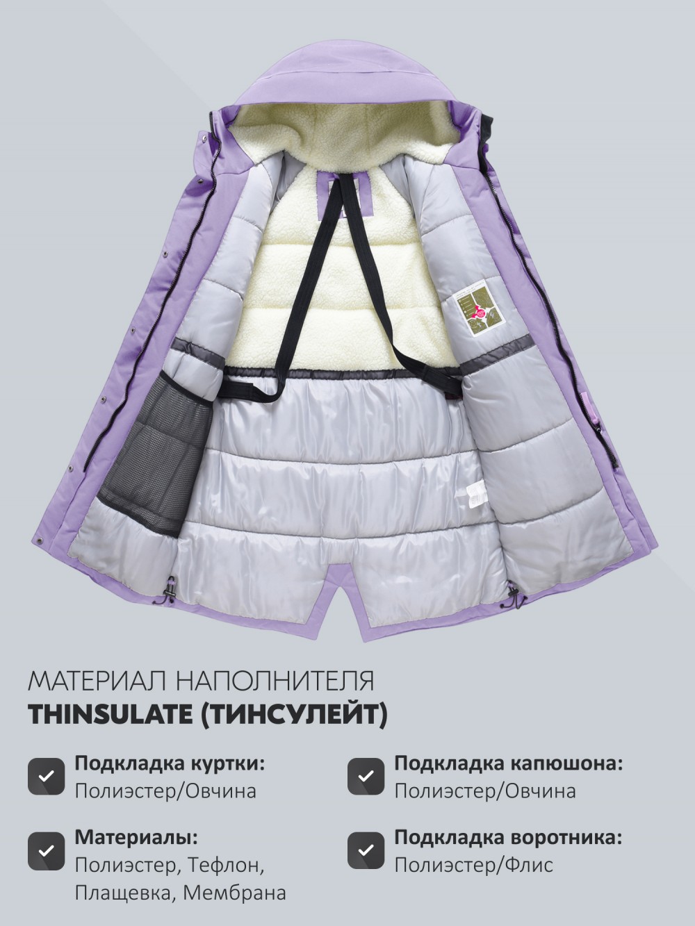 Внутренняя подкладка из овчины, полиэстера и флиса создаёт ощущение уюта и мягкого тепла. Несъёмный капюшон плотно прилегает, защищая голову от ветра и снега, а воротник-стойка надёжно закрывает шею. Регулируемые фиксаторы на рукавах, по низу и на капюшоне позволяют подстраивать посадку и сохранять тепло внутри.